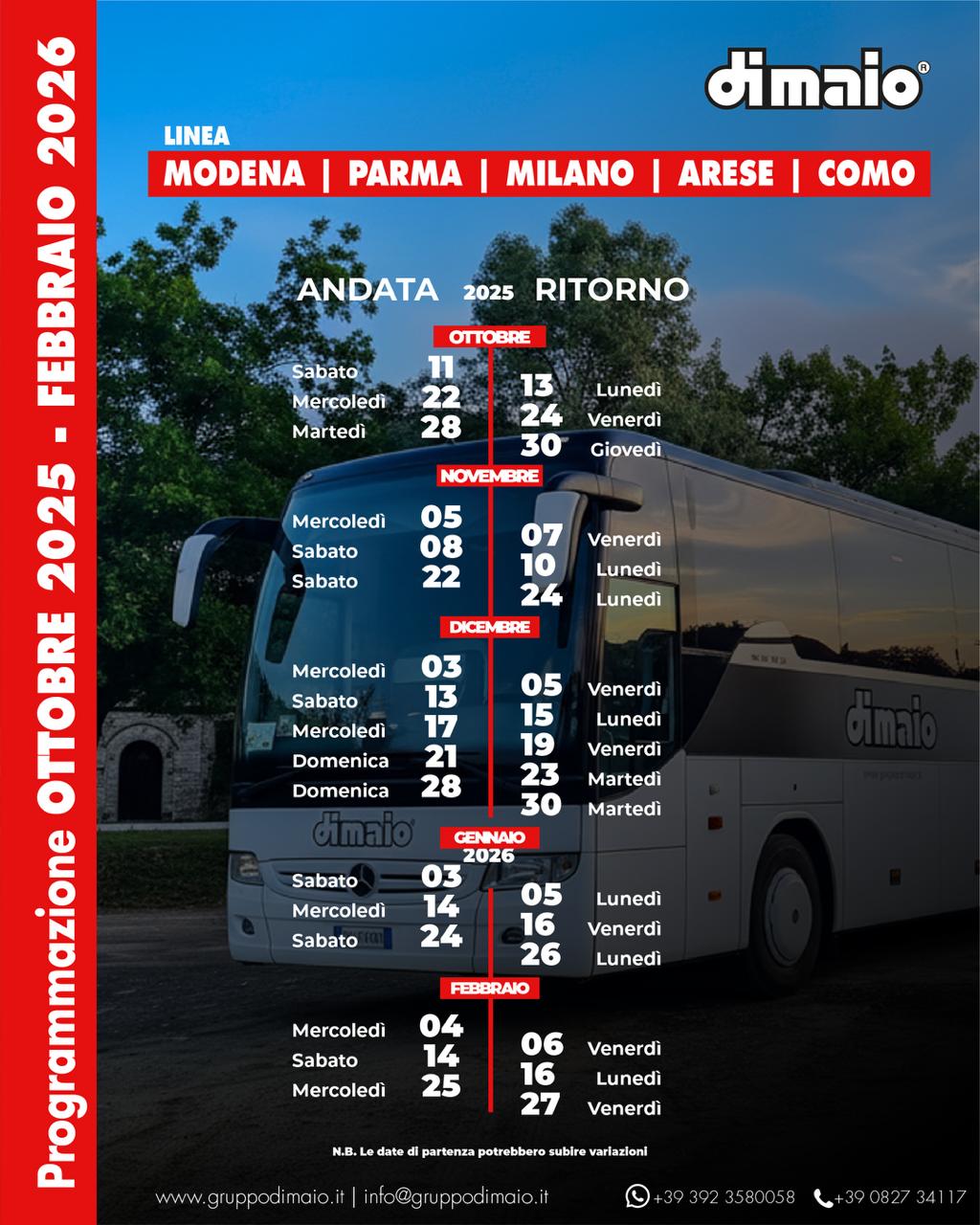 6 ottobre 2025 Prossime partenze Linea Modena - Parma- Milano- Arese - Como da Ottobre 2025 a Febbraio 2026 Prossime partenze Linea Modena - Parma- Milano- Arese - Como da Ottobre 2025 a Febbraio 2026 Consulta le date di partenza