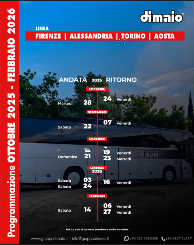 6 ottobre 2025 Prossime partenze Linea Firenze - Alessandria- Torino- Aosta da Ottobre 2025 a Febbraio 2026 Prossime partenze Linea Firenze - Alessandria- Torino- Aosta da Ottobre 2025 a Febbraio 2026 Consulta le date di partenza